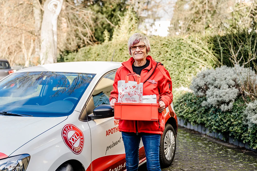 Wenn der Weg in die Apotheke gerade nicht möglich ist oder es einfach schneller gehen soll, liefern wir Ihre Medikamente direkt zu Ihnen nach Hause. Bestellen Sie bequem telefonisch, über unsere App oder im Online-Shop. Geht Ihre Bestellung bis 15 Uhr bei uns ein, erhalten Sie Ihre Medikamente in der Regel noch am selben Tag. Die Lieferung ist für Sie kostenfrei und auch rezeptpflichtige Medikamente stellen kein Problem dar. Bezahlen können Sie ganz unkompliziert bar oder per Karte an der Haustür. Wir möchten, dass Sie sich auf uns verlassen können, auch wenn Sie einmal nicht persönlich vorbeikommen.
